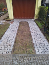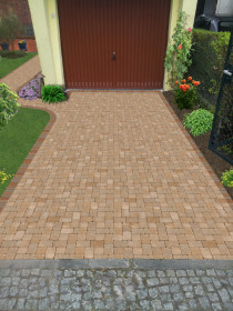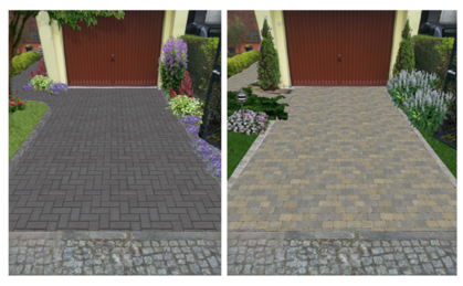 Nur 3 Beispiele zur möglichen Gestaltung der oben gezeigten Gartensituation. Die Bildbearbeitung zeigt sowohl Veränderungen im Pflasterbereich Garageneinfahrt/Weg als auch unterschiedliche Bepflanzungen.